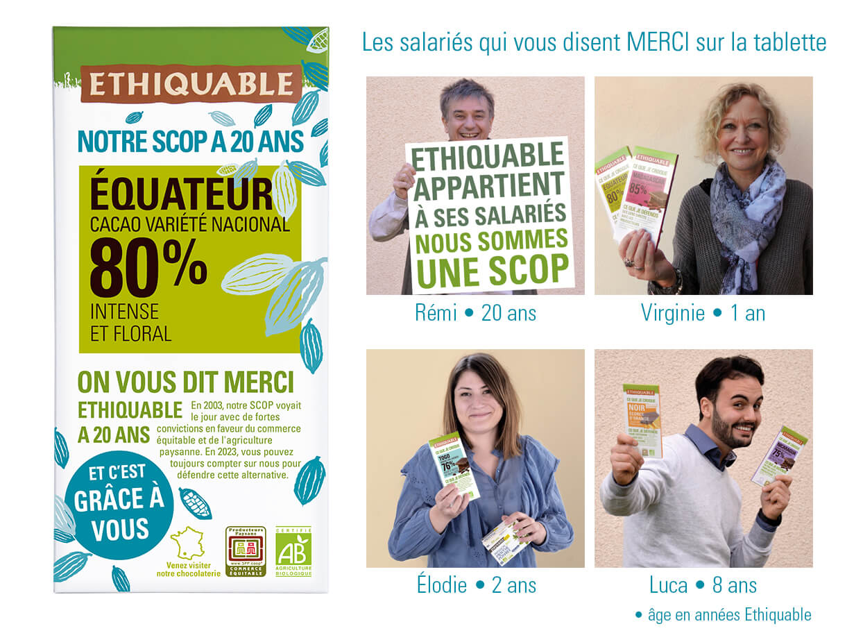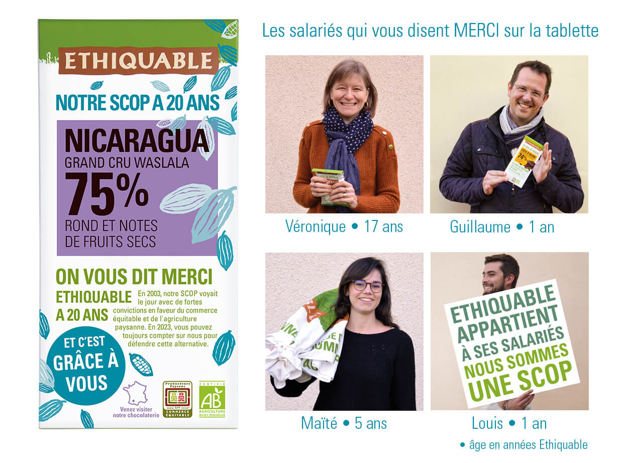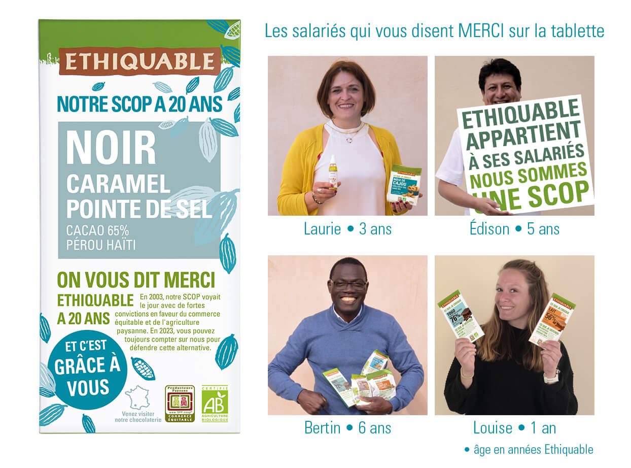 De 0,5 à 20 ans de présence chez Ethiquable, tous affichent au dos des tablettes leurs meilleurs profils pour vous et signent le petit message qui vous est adressé au nom de toute l'équipe !