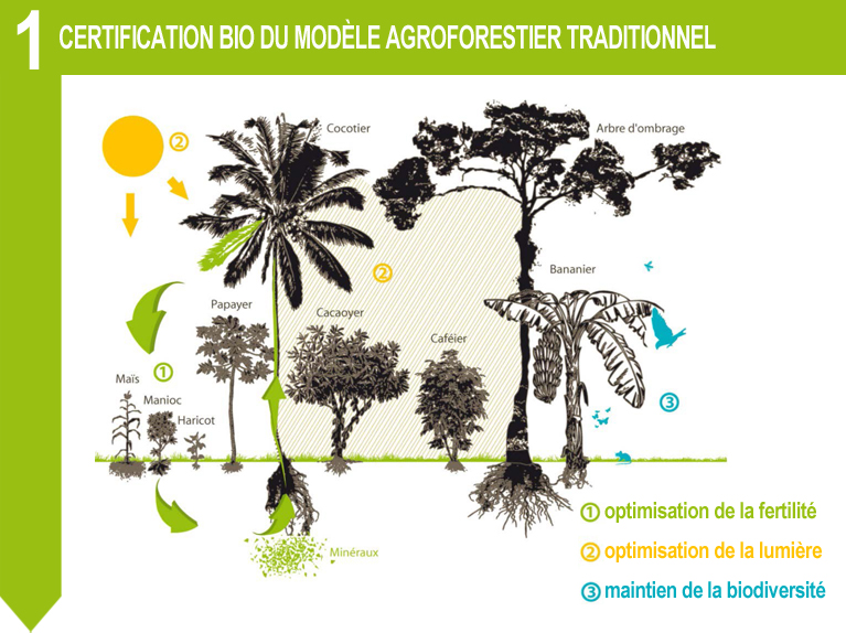Au moment où les coopératives démarrent le processus de certification bio, les producteurs pratiquent des systèmes agro-forestiers autonomes et rustiques, dans lesquels la fertilité des sols est maintenue par les feuilles tombées des grands arbres d'ombrage qui puisent les éléments minéraux en profondeur. Ces systèmes traditionnels basés sur une grande diversité de cultures associées et des variétés locales, offrent une bonne résistance aux maladies et ravageurs.